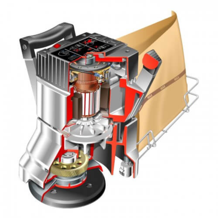 - The drive is transmitted through a robust hardened steel alloy pinion and a large diameter aluminium bronze drive gear, ensuring consistent power delivery to the sanding disc without slipping or stalling, even under heavy load.