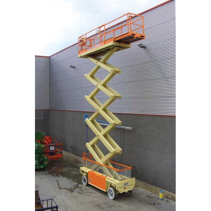 - Comprehensive Safety Features: Includes a load sensing system, 3-degree tilt indicator light with cut-out, ground control selector switch with key lock, proportional drive control, two-speed drive selection, battery condition indicator, hour meter, horn, and manual descent system for emergency lowering. Steel mesh scissor guards enhance safety.