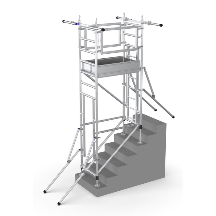 • One of the standout features is the walk-through base frame design. This allows for uninterrupted access up and down the staircase even while the tower is erected, which is critical for maintaining emergency exit routes and improving site logistics (allowing movement of other trades or materials).