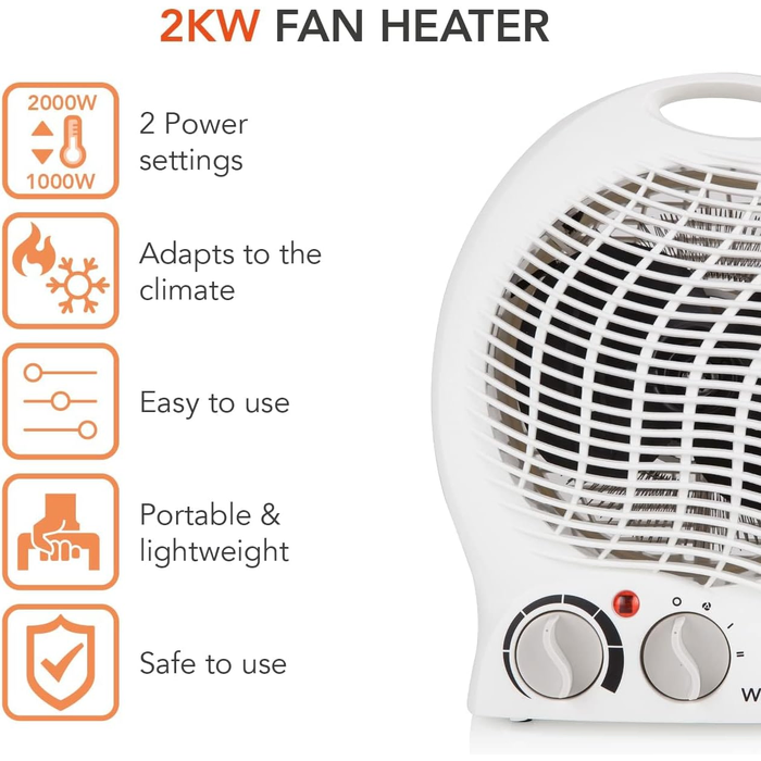 - 2kW Heat Output: Delivers a maximum heating power of 2 kilowatts (kW), providing ample warmth for small to medium-sized rooms, offices, or personal workspaces.