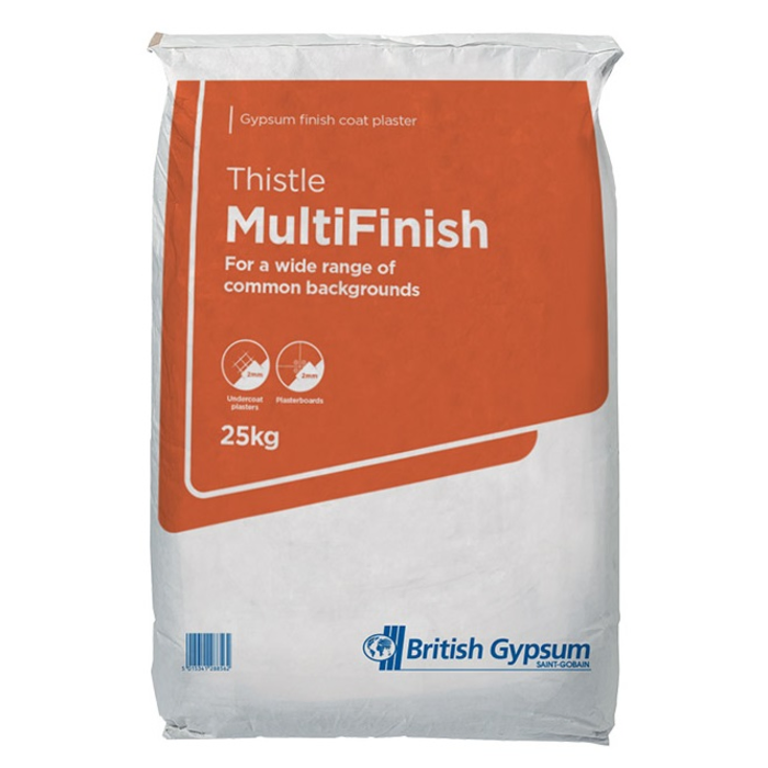 British Gypsum Thistle MultiFinish Plaster is the market-leading, all-purpose gypsum-based finish plaster, supplied in a convenient 25kg bag. It's meticulously formulated to provide a smooth, high-quality, and durable surface on a vast array of common backgrounds, making it the go-to choice for plasterers across the UK. Whether you're working on new builds, renovations, or simply patching existing walls, MultiFinish offers excellent workability and a consistent, high-standard finish ready for decoration.