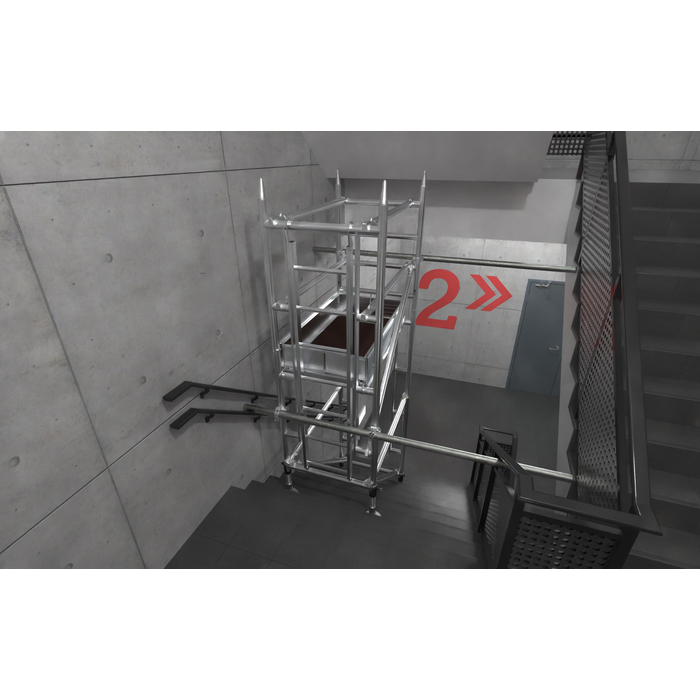 • One of the standout features is the walk-through base frame design. This allows for uninterrupted access up and down the staircase even while the tower is erected, which is critical for maintaining emergency exit routes and improving site logistics (allowing movement of other trades or materials).