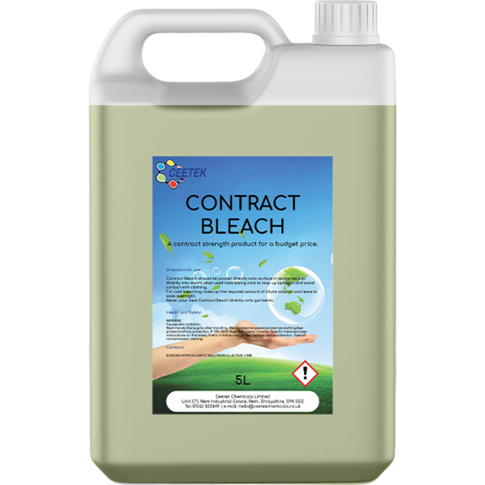 Ceetek 5L Contract Bleach is a powerful and highly effective cleaning, disinfecting, and deodorising solution designed for a wide range of challenging domestic, commercial, and industrial applications. This concentrated bleach is formulated to kill a broad spectrum of bacteria, viruses, and fungi, ensuring superior hygiene across hard surfaces. Its strong oxidising action makes it exceptionally effective at removing tough stains, whitening surfaces, and eliminating unpleasant odours. Supplied in a large 5-litre container, Ceetek Contract Bleach offers a cost-effective and robust solution for maintaining cleanliness and sanitation in demanding environments.