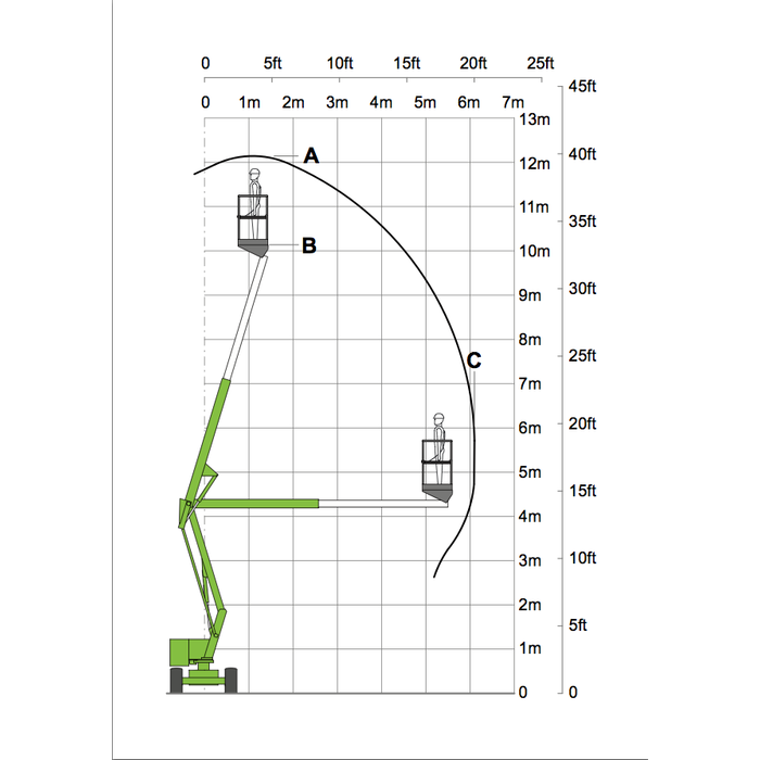 - 6.1m (20 ft 0 in) Horizontal Outreach: Provides a significant horizontal reach, enabling operators to access work areas over obstacles or at a distance from the machine, enhancing versatility.