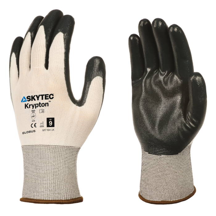 The SKYTEC KRYPTON gloves are high-performance cut-resistant gloves designed for demanding environments where both safety and dexterity are critical. Made with a high-strength HPPE (High-Performance Polyethylene) and glass fibre liner, and a durable nitrile foam palm coating, these gloves provide exceptional cut protection, superior grip, and lasting comfort.